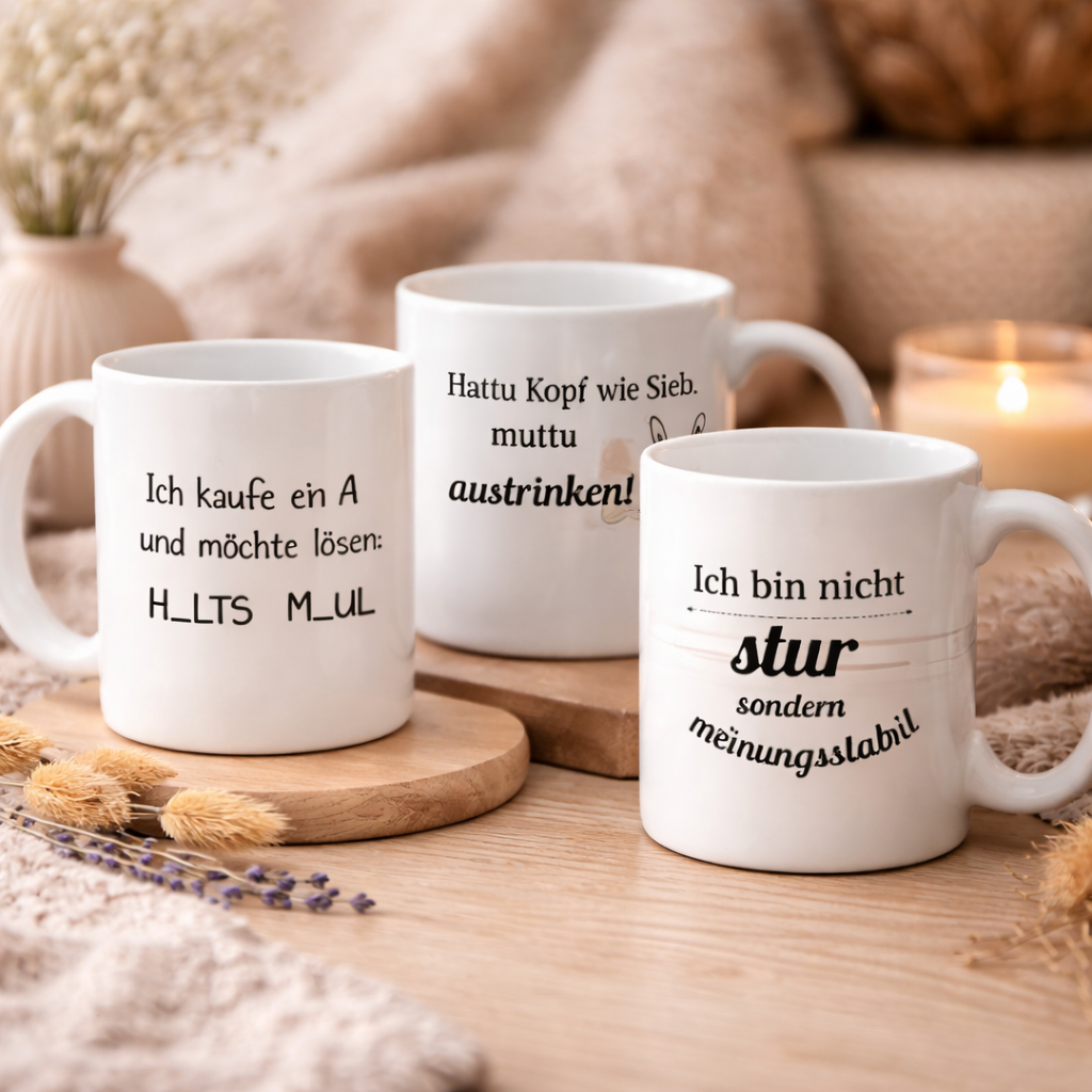 Wir produzieren auf Anfrage individuelle Tassen für Firmen, Events, Messen, Jubiläen, Mitarbeitergeschenke oder Werbeaktionen. Ob mit Logo, Slogan oder individuellem Design – wir gestalten Ihre Event-Tassen ganz nach Ihren Wünschen und sorgen für eine hochwertige Umsetzung.